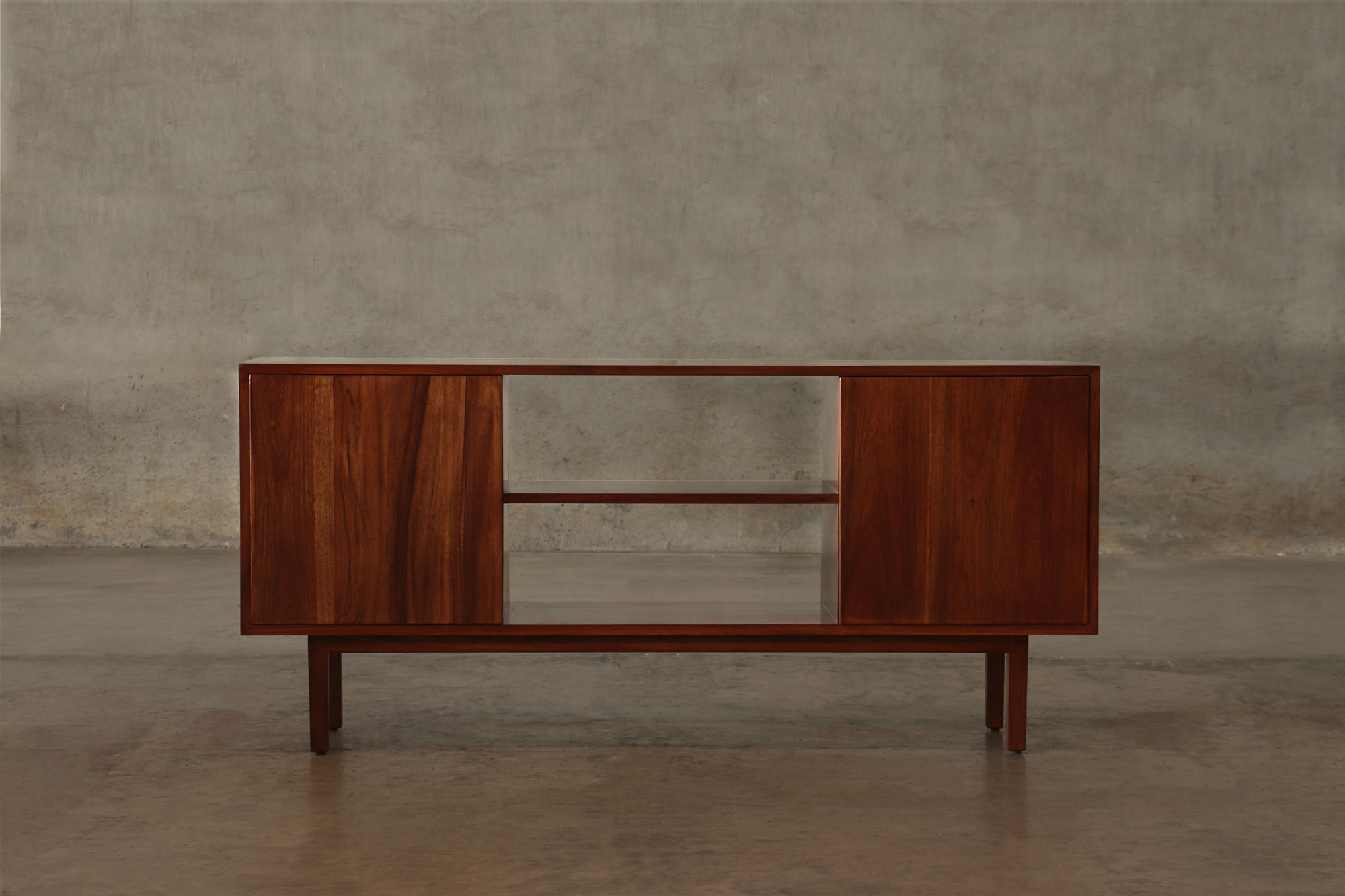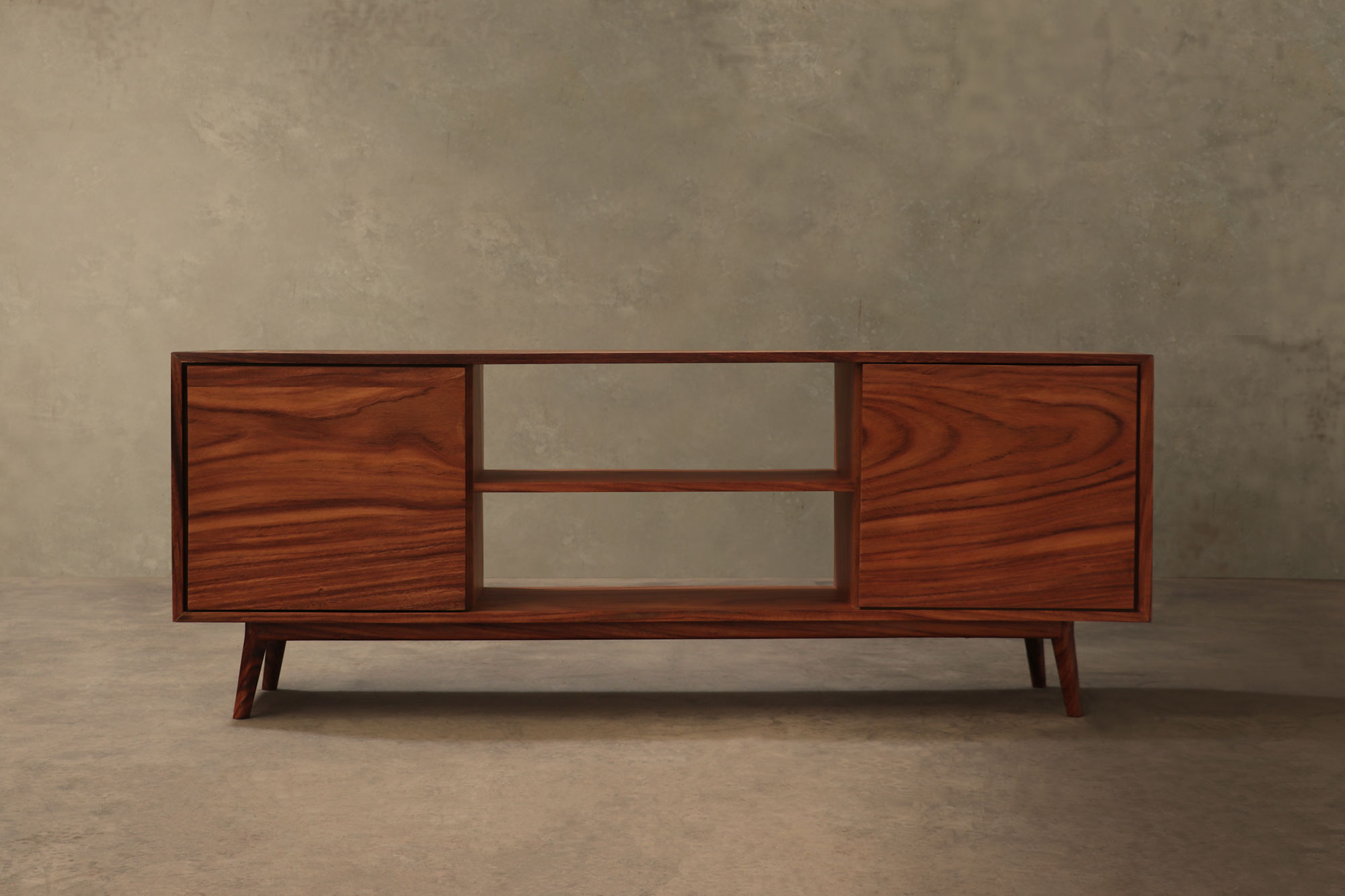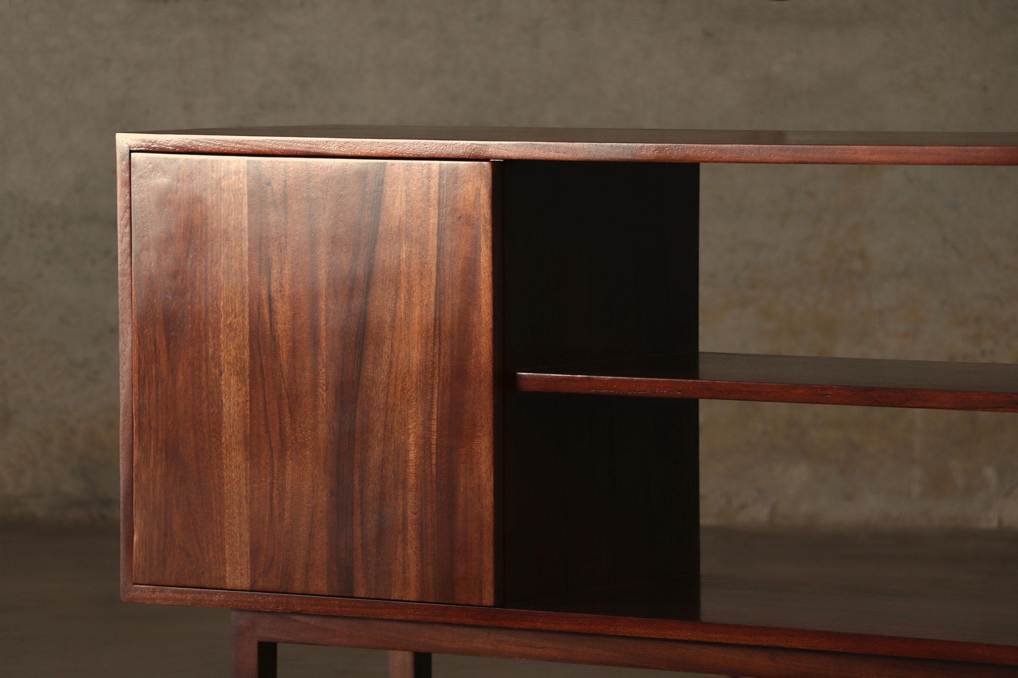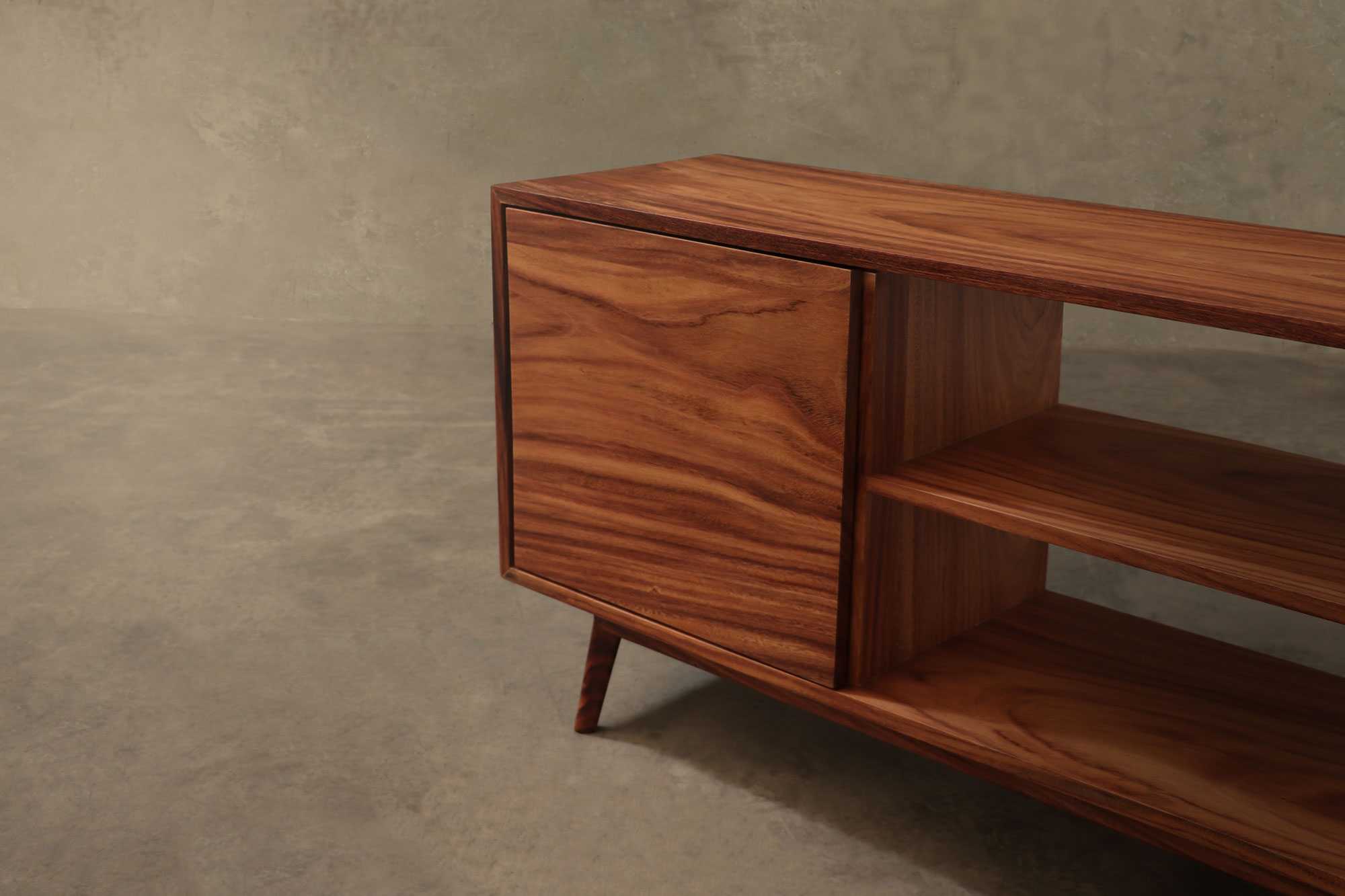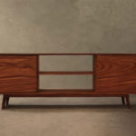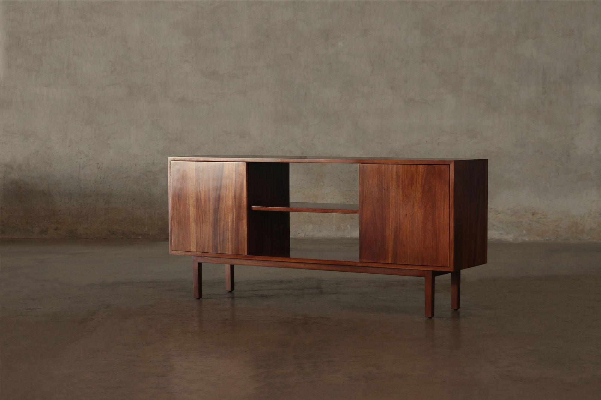 Una credenza muy funcional, con espacios cerrados para almacenar, pero también abiertos para colocar objetos decorativos. Personalizable en tres tamaños y tres tipos de madera.