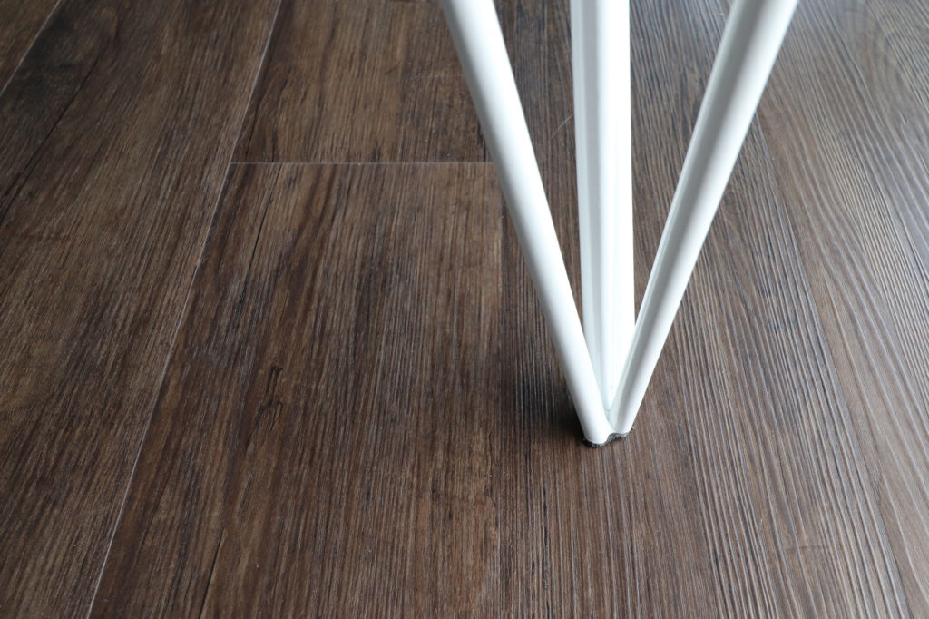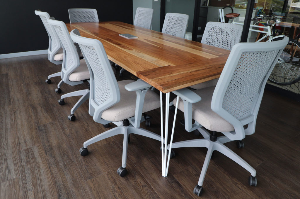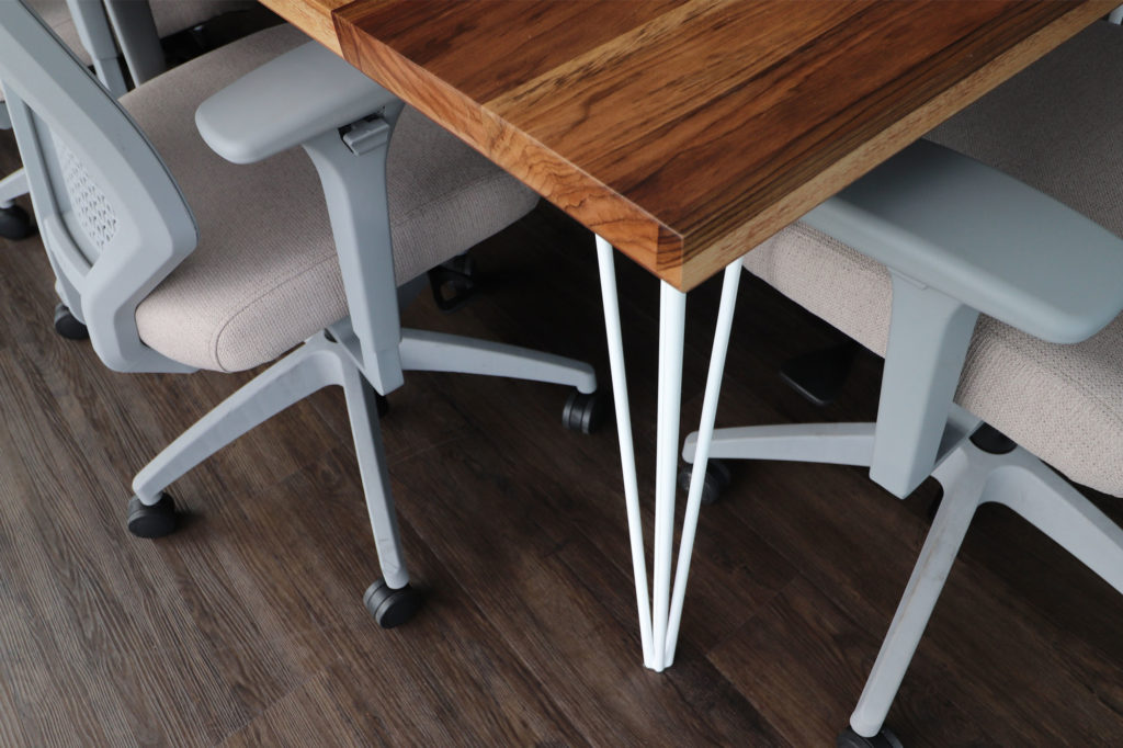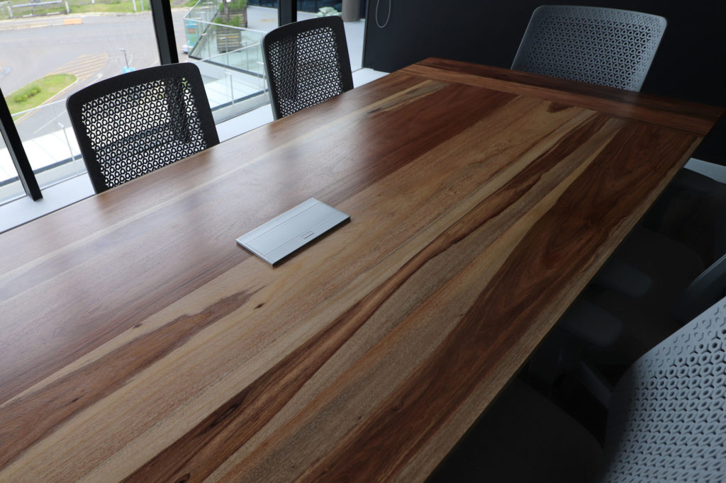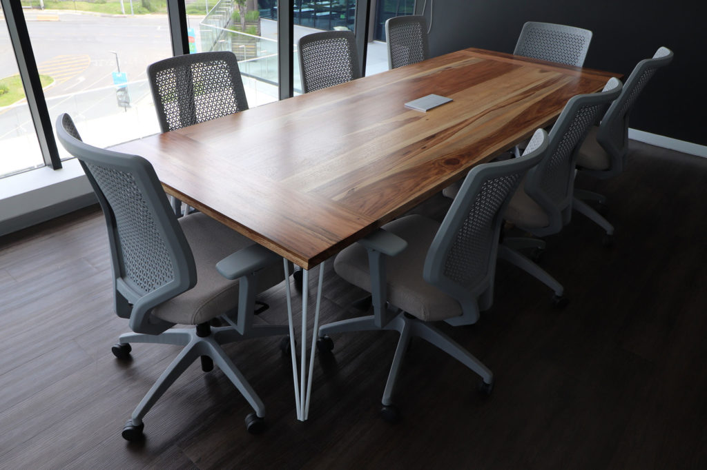 Mesa personalizada para reuniones en mesa de laurel de 2” de espesor, con estructura metálica blanca con pintura electrostática (powder coated) color blanca, y caja de conexiones HDMI, datos y electricidad.